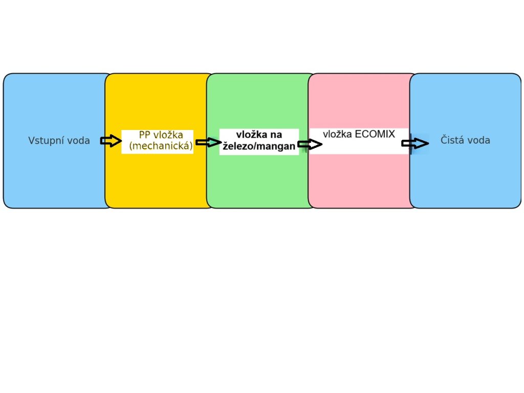 Doporučené řazení filtračních vložek za sebou ve směru toku vody: antibakteriální filtrační vložka - filtrační vložka na železo - filtrační vložka Ecomix