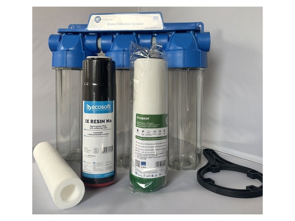 Tato sestava perfektně funguje na odstranění mechanických částic, sedimentů a rzi z vody a zároveň odstraní chlór, zápach a zlepší chuť vody s pomocí uhlíkové složky z kokosových skořápek a navíc díky vložce IX Resin vodu změkčuje a ochrání tak vaše spotřebiče. Sestava vodní filtr 6 - filtrační trojitá nádoba o velikosti 3 x 10" a tři filtrační vložky. Filtrační vložka na odstranění mechanických nečistot do 5mcr a filtrační vložku uhlíkovou s KDF a filtrační vložku IX Resin od výrobce ECOSOFT na změkčení vody - všechny o velikosti 10"x2,5". Uhlíková filtrační vložka obsahuje jemně rozdrcený aktivní uhlík, skořápky z kokosového ořechu a netkaný polypropylen. Slouží k odstranění až 99% chlóru, železa, organických kontaminantů, pesticidů a mechanické pevné látky.